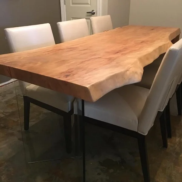 This is a live edge sycamore table we created with a glass leg. It makes a great addition to a conference room!